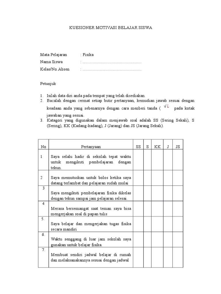 Contoh Angket Motivasi Belajar Siswa Sd Kumpulan Soal Pelajaran 5