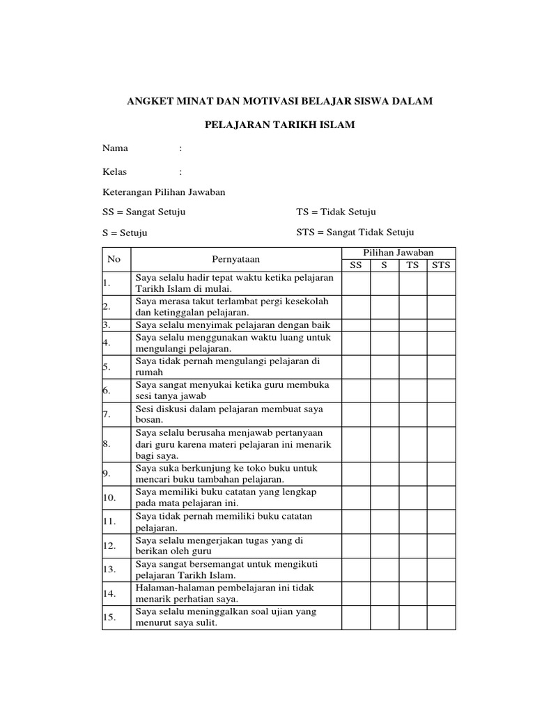 Mulailah mengisi dengan membaca Basmalah Keterangan. Embed Angket Motivasi belajar. Kondisi Angket Minat Angket Motivasi Nomor Pernyataan Positif Nomor Pernyataan Negatif Nomor Pernyataan Positif Nomor Pernyataan Negatif 1.