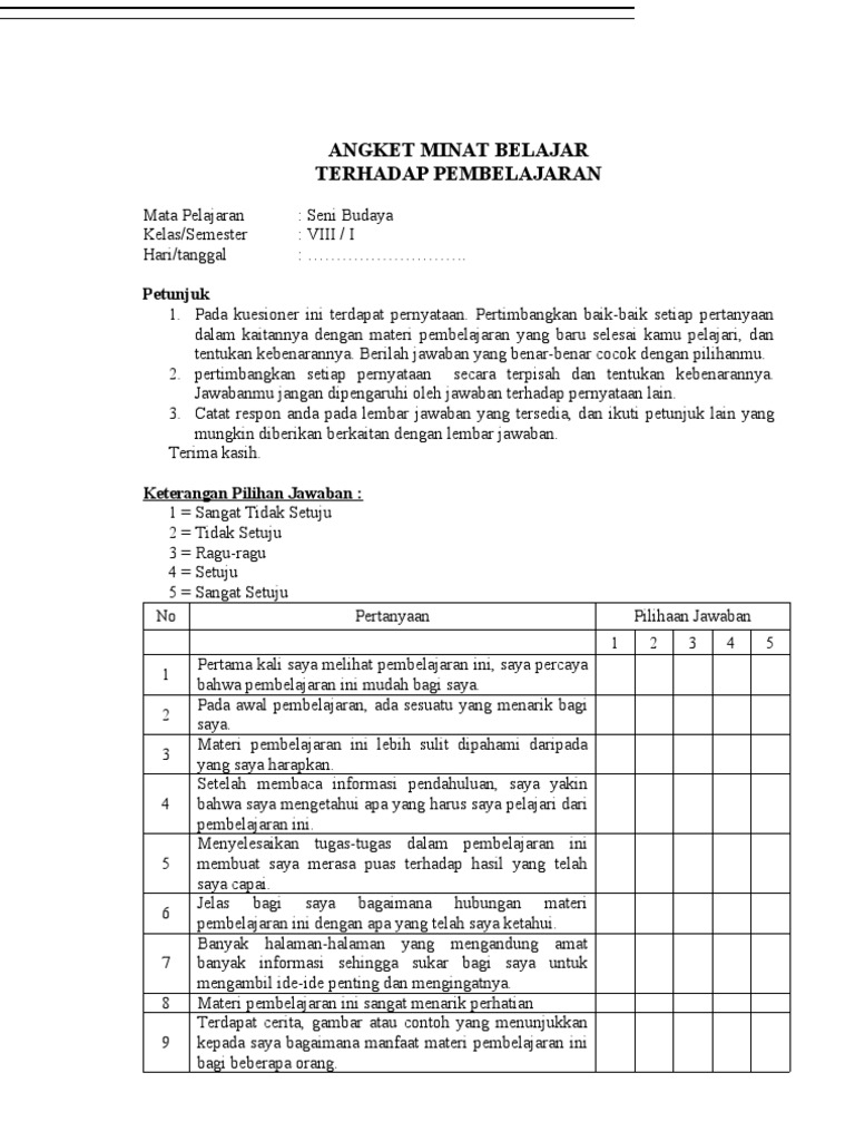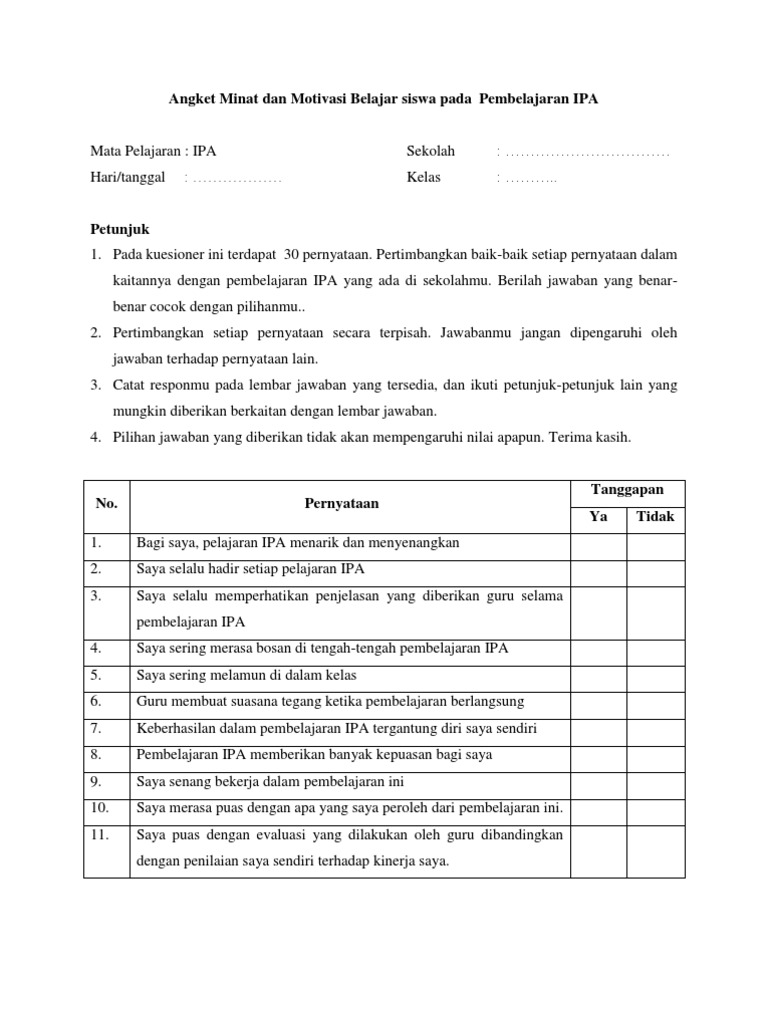 Tuliskan Nama dan Kelas 3. PDF INDIKATOR MINAT BELAJAR Azmi Faisal - Academiaedu PENGGOLONGAN PERNYATAAN DALAM ANGKET MINAT DAN MOTIVASI BERDASARKAN KRITERIA DAN KONDISI No. Walau gimanapun proses belajar mengajar di jaman sekarang tidak luput dari yang namanya teknologi.