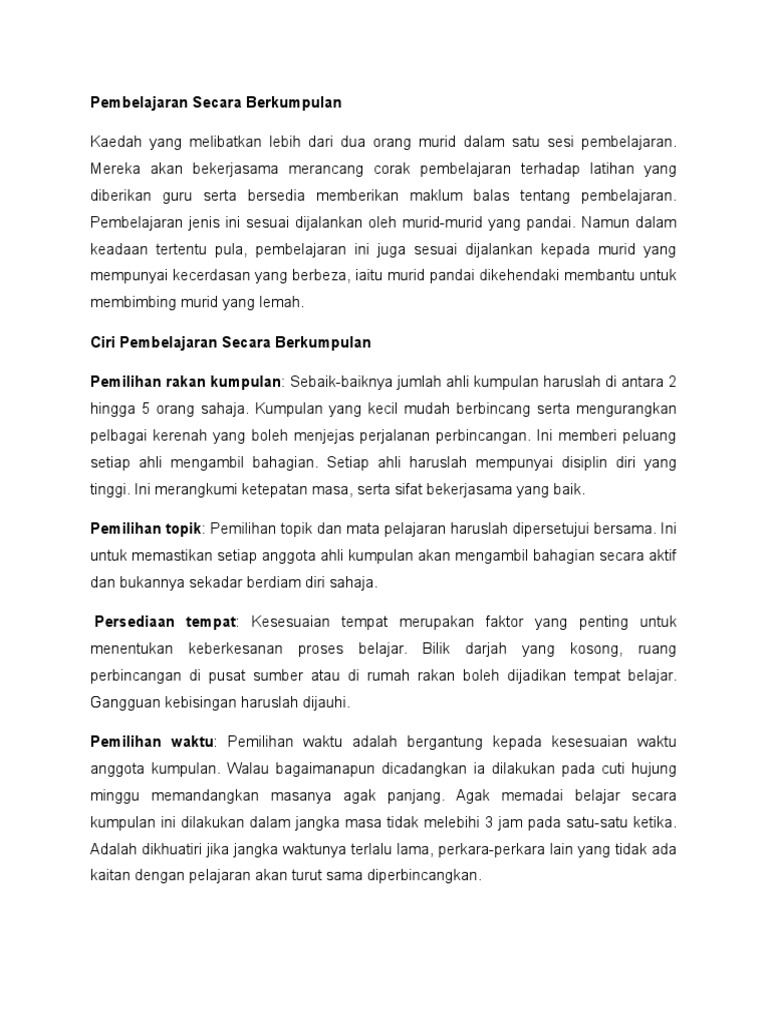 Kajian didahului dengan menentukan gaya pembelajaran yang dominan menggunakan Soal Selidik Gaya Pembelajaran yang terdiri daripada konstruk individu dan berkumpulan. 2462012 Seterusnya apabila belajar secara berkumpulan biasanya setiap kumpulan akan mempunyai sekurang-kurangnya lima hingga enam orang ahli dan sekiranya dua orang daripada kumpulan itu tidak dapat hadir atas sebab-sebab tertentu itu tidak akan menjadi suatu masalah kerana masih terdapat empat orang ahli yang boleh bekerjasama untuk membincang dan. Hadirin sekalian Melalui pembelajaran secara berkumpulan Kita dapat melakukan perbincangan secara mendalam terhadap sesuatu tajuk pembelajaran atau permasalahan yang timbul.