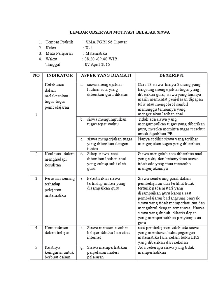 Lembar Observasi Motivasi Belajar Siswa