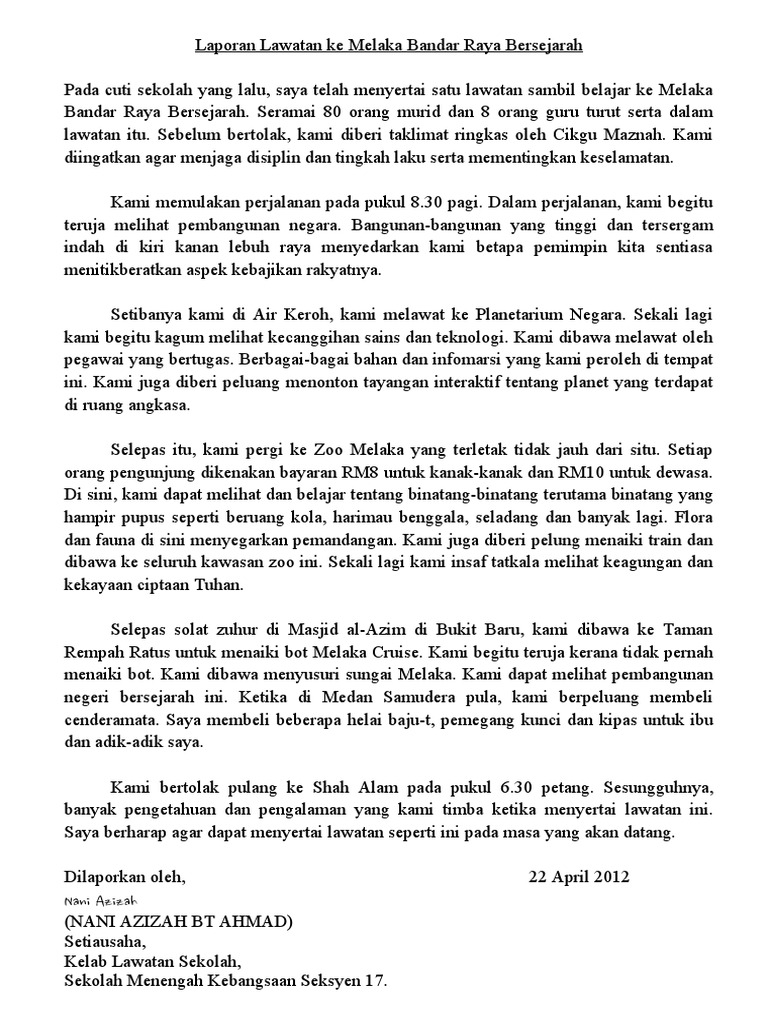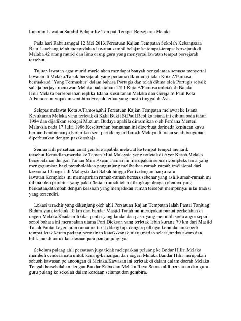 Aktiviti belajar sambil melawat merupakan kaedah yang sungguh berkesan dalam pendidikan subjek sejarah kepada pelbagai peringkat pelajar. Karangan laporan lawatan sambil belajar laporan sambil belajar ke bangunan parlimen pada 5 mei 2013 yang lalu seramai 35 pelajar daripada persatuan sejarah sekolah menengah kebangsaan st. Laporan Lawatan Ke Melaka Bandar Raya Bersejarah.